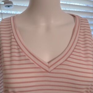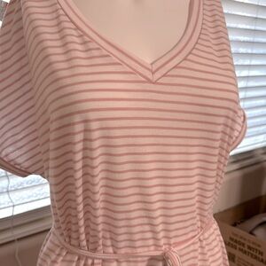 Casual pink striped dress with a V-neck and tie waist. Perfect for everyday wear.