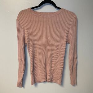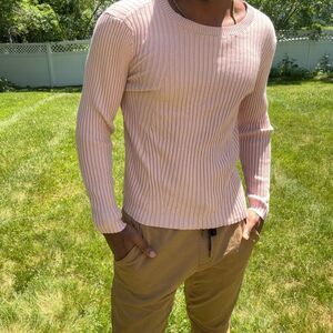 This is a pink sweater by H&M that is in excellent condition ! It’s a slim fit that looks cute on anyone, it is listed as a size large in women’s but fits a medium easy. It also can fit a medium in men’s