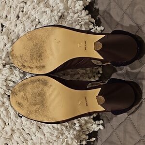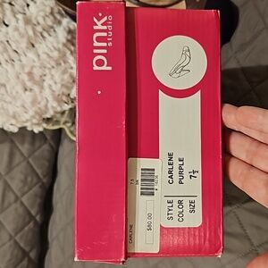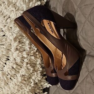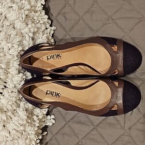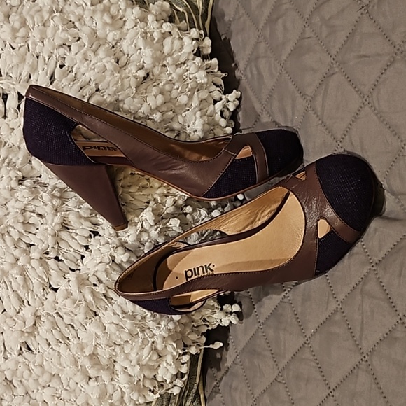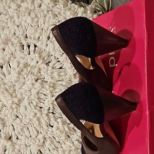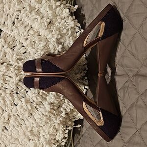 Pink Studio Carlene mauve/brownish leather with purple textured fabric detail size 7.5M, round toe, slip-on, leather wrapped 4" heels, in original box, gently worn in excellent condition see all photos for details!