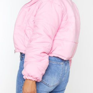 Add a fiercely feminine vibe to your look with this puffer. Featuring a pink peach skin material with a zip fastening and a super cropped length. Style this with your existing wardrobe pieces to complete the look.