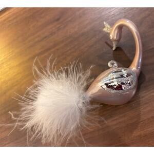 This is a hand-blown glass swan Christmas tree ornament with a feather tail.