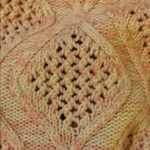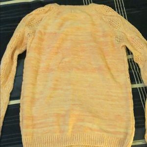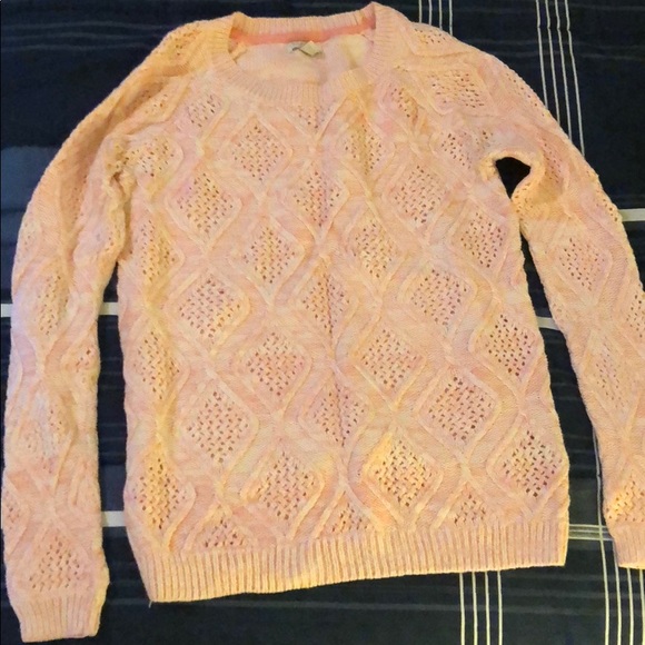 Thick pink sweater. Worn maybe 2-3 times. Hole pattern on front and sleeves is see through so you would probably want to wear tank or shirt underneath.