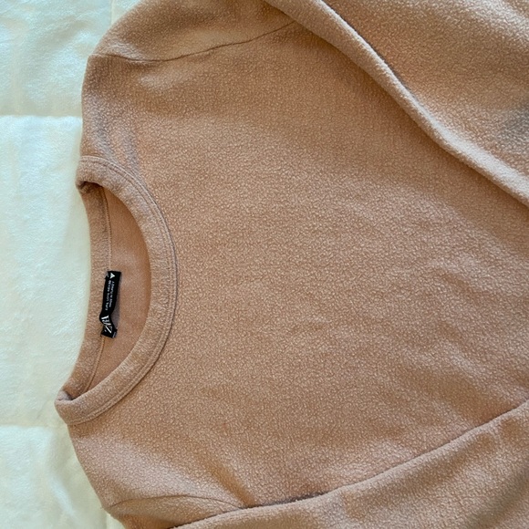 Super comfy sweater. A little bit on the cropped side. Pre-loved. Excellent condition. Large in kids. Subtle pink color.