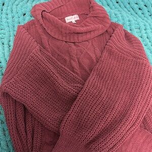 This pink cowl neck sweater features a beautiful cable knit pattern, offering both style and warmth. Its relaxed fit ensures comfort, making it a perfect choice for chilly days. The sweater's thick fabric and wide collar add to its cozy appeal. New never worn bought but live in Florida so it wasn’t needed