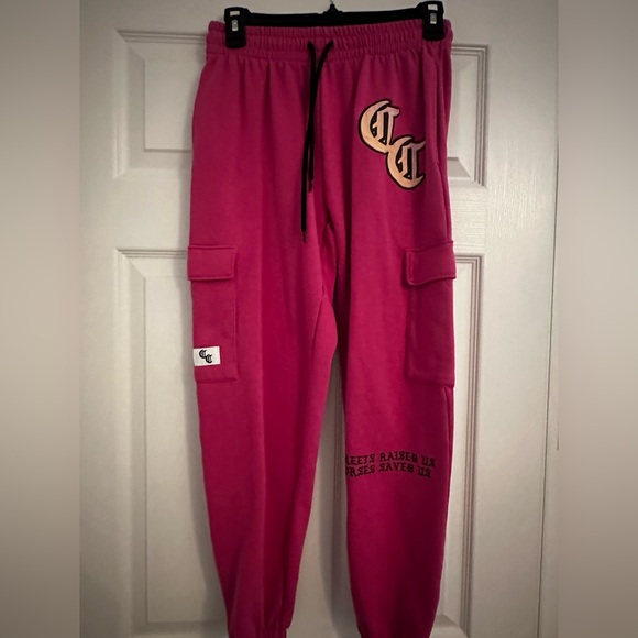 Stylish pink sweatpants featuring a bold logo design. Comfortable and trendy.