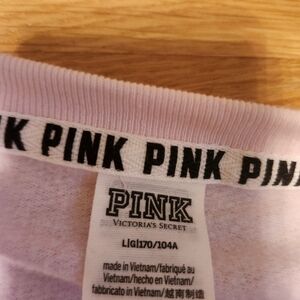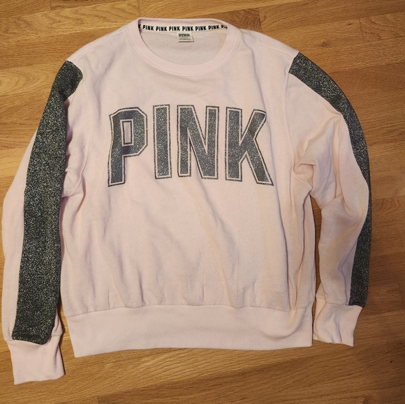 Stylish pink sweatshirt featuring glittery sleeves. Perfect for casual wear. Practically new, Victoria Secret, PINK sweatshirt. Size large. Comes from a smoke free and pet free home!
