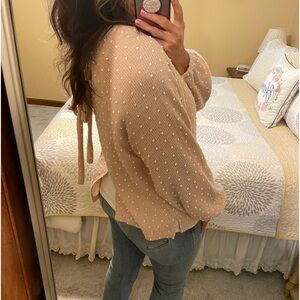 Beautiful, soft and lightweight pale pink Swiss dot sweater.  Back tie and elastic sleeves for various sleeve length styles.