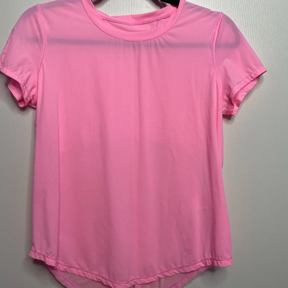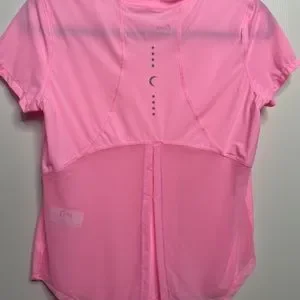 Lightweight pink T with a satin feel. Mesh split detailing in the back with the option to tie for a more fitted look. Reflective logo. Like new condition. Smoke free pet friendly home