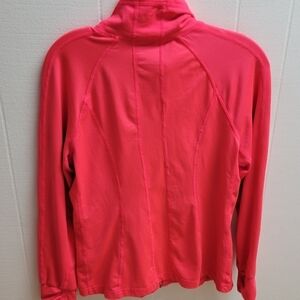 tangerine hot pink jacket. zip up. multiple pockets. fitted. perfect for running! mock neck.
