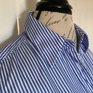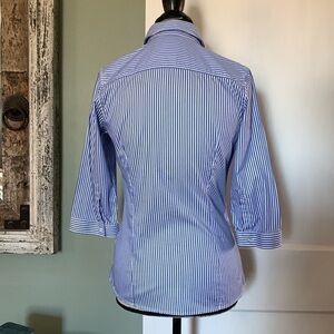 Blue and white 3/4 sleeve striped button down shirt by PINK THOMAS PINK JERMYN STREET LONDON.