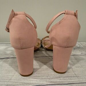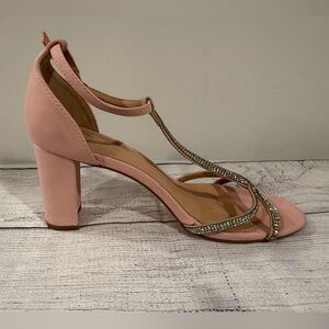 These pink T-strap suede heels feature a vintage-inspired design with a comfortable block heel, perfect for formal occasions. The soft blush color and delicate metallic trim add a touch of elegance, while the peep-toe design ensures a stylish look.