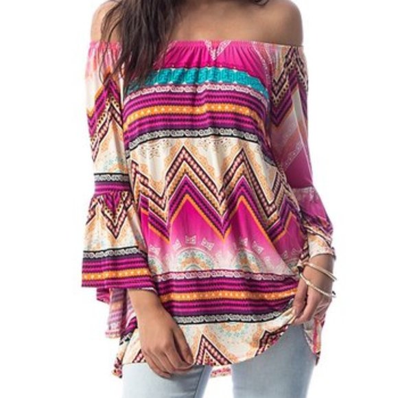 Pink & Tan Chevron Bell-Sleeve Off-Shoulder Tunic