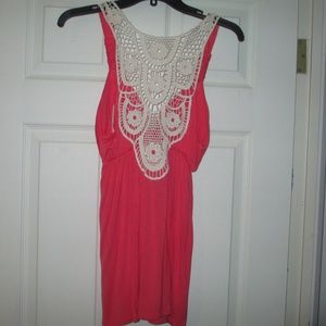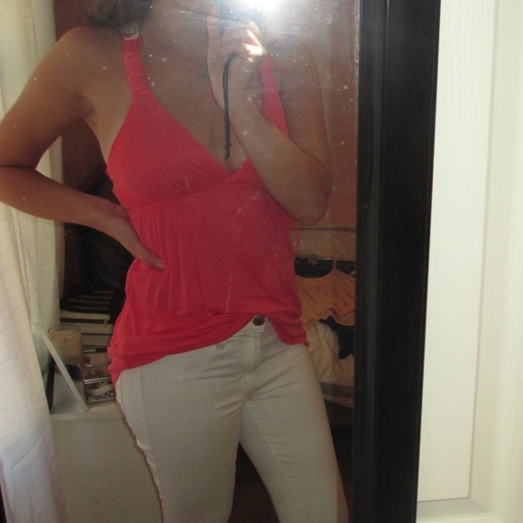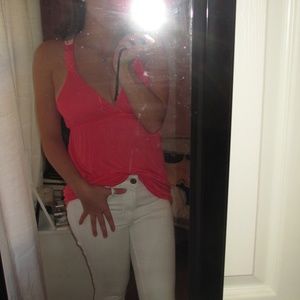 Pink tank top with plunging neckline and lace detailing