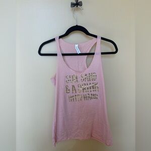 Pink tank top featuring gold text 'Sun, Sand & A Drink in My Hand'. Perfect for casual outings or bachelorette parties