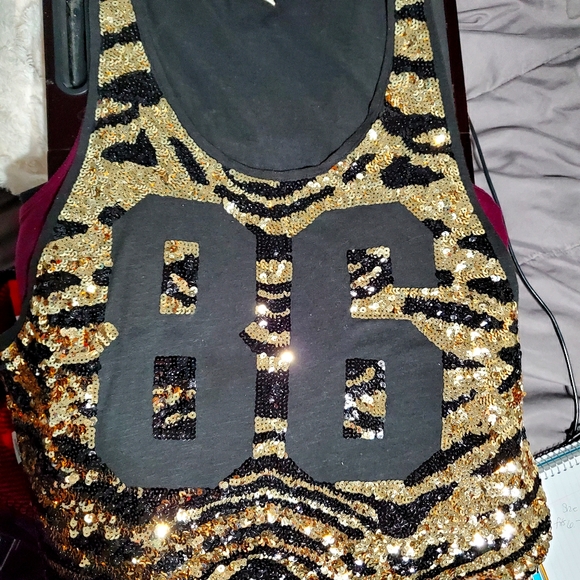 Black with gold sequins on front, Black numbers 86, size L, wore few times