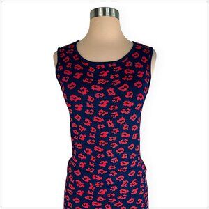 Back zip closure. Fitted sleeveless sheath style with a cute overlap slight peplum waist detail. Done in a dark navy blue with vibrant red leopard animal print design. Lots of stretch for a comfortable fit. Mini length. High quality knitwear.