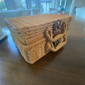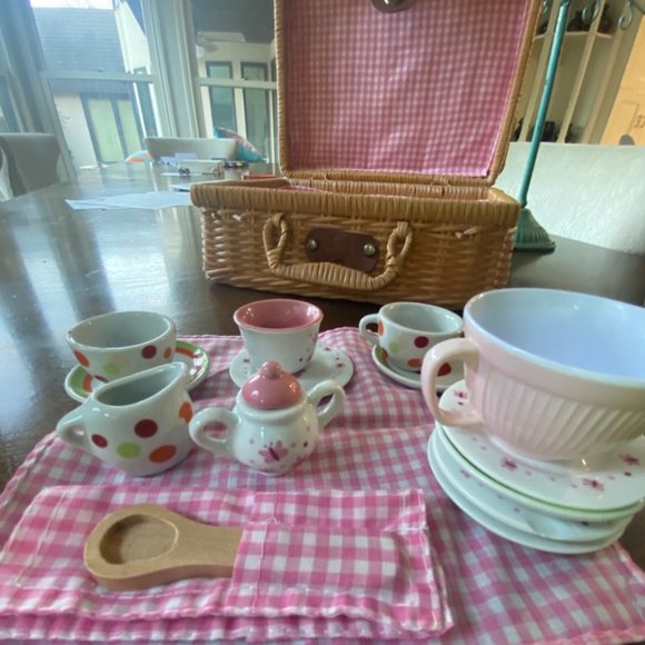 Tea set includes: 3 tea cups, 1 mixing spoon, 7 plates, 1 pitcher, 1 sugar container, 1 napkin (not included in the pictures), 1 picnic banket, 1 cloth spoon case, 1 basket, 1 creamer.