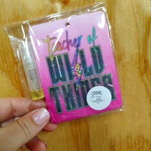 Vibrant pink air freshener with 'Teacher of Wild Things' design. Includes a small vial of scent.