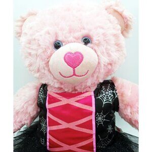 This Build a Bear plush toy stands at 15" with piercing blue eyes. Adorned with a pink and black spiderweb glitter tutu and black and pink striped pants, it's the perfect cuddle companion.