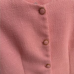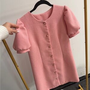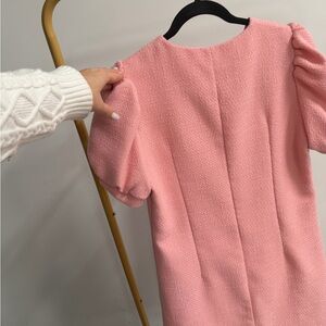 Chic pink dress with textured fabric and button-up front. Features short puff sleeves.