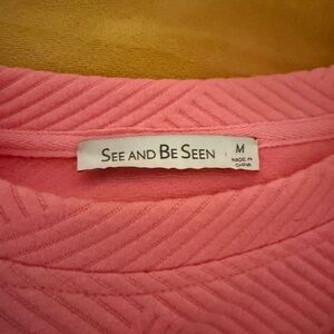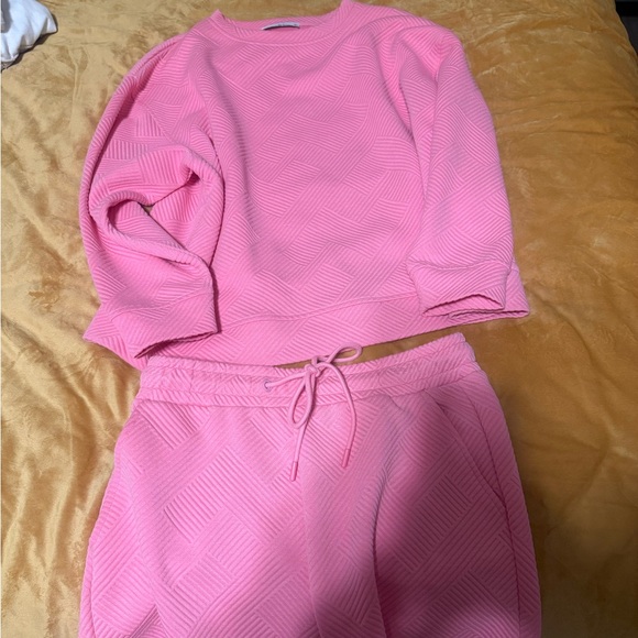 Cozy pink textured sweatsuit set. Includes a long-sleeve top and drawstring shorts. Perfect for lounging. Top is medium shorts are large