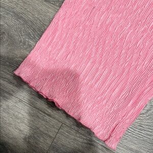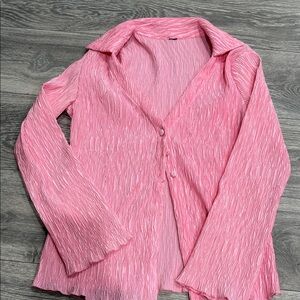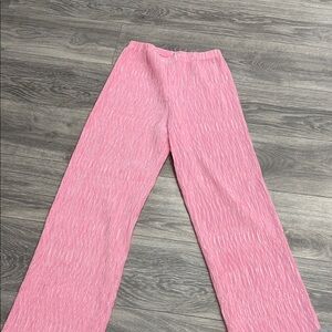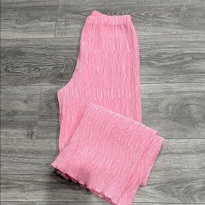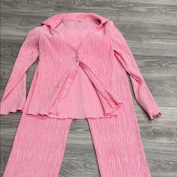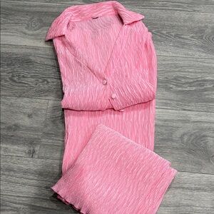 Stylish pink two-piece set with a textured design. Includes a long-sleeve top and matching pants.