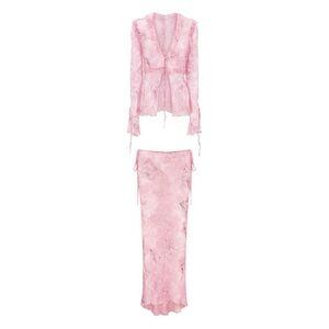 Stylish pink tie-front top and skirt set. Perfect for a chic look. Sold out online