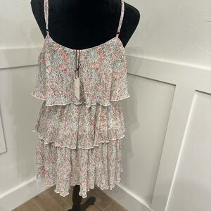 This sleeveless sundress is perfect for a cocktail party or a casual night out, featuring a playful tiered and ruffled design. The spaghetti straps and v-neckline add a touch of elegance to its vibrant pink hue, making it a standout piece for any occasion.