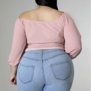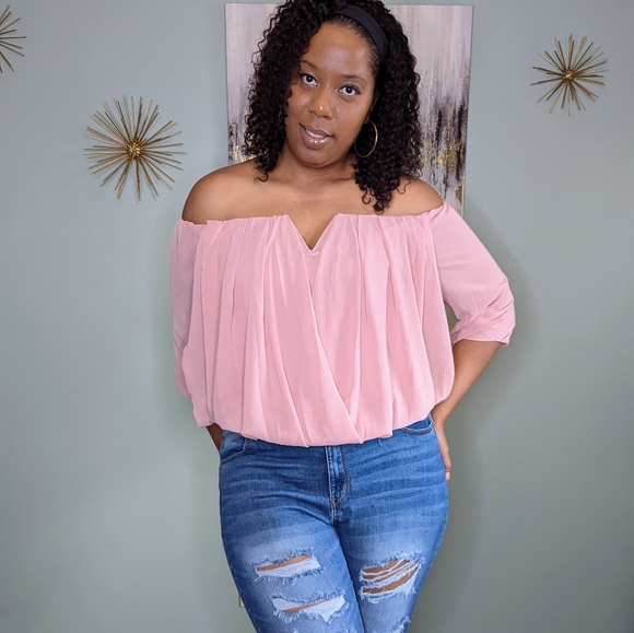 Stay pretty in pink in our chiffon off the shoulder, neck stretchy front surplice top. Perfect when paired with skinny leg jeans, fitted skirts or bermuda shorts. Size 1X shown in photo.