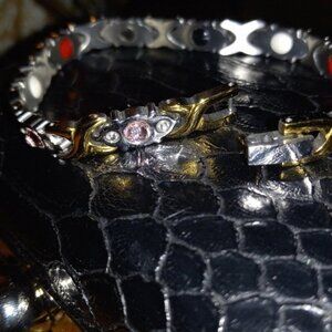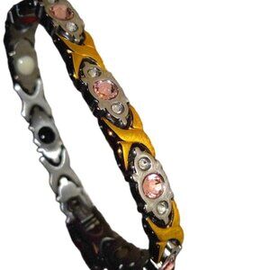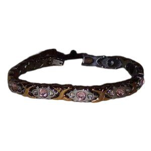 Pink tourmaline w alternating gold & silver-toned Stainless Steel.