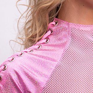 Draw yourself into a state of euphoria when dancing in the Pink Trance Lace Up Mesh Crop Top from J Valentine. This pulsing rave festival tops features a pink colored netting bodysuit contrast with pink holographic cap sleeve and pink lace-up details, silver hardware eyelet accent, crew neckline, and zipper opening in the back. Let's go get lost in the dazzling spectacle of light and sound.