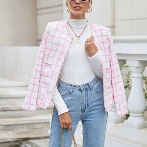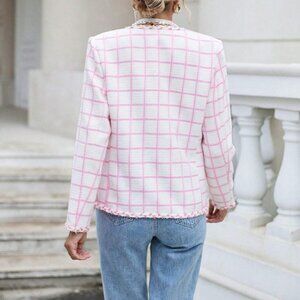 Pink Trendy Womens Plaid Print Open Front Pocket Patched Overcoat