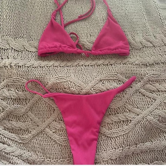 Stylish and vibrant pink triangle bikini set perfect for a day at the beach. Enjoy comfort and style with this must-have swimwear.
