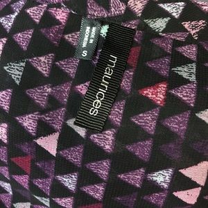 Super cute and airy black top with pink/purple/gray triangles. Button front and tab sleeves for pulling up. 100% poly Machine wash cold. Like new! Non-smoking home.