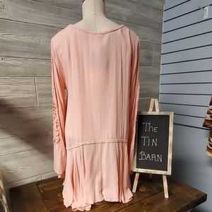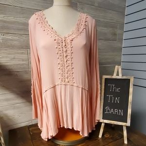 Umgee pink lace tunic. Has a small smug on left shoulder. New with tags. Last one. Such a cute high low.