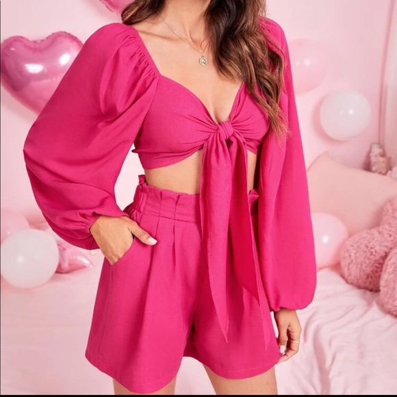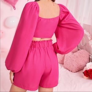 Super cute pink two piece set. Puffy long sleeve top with a tie in the center. Shorts are stretchy and comfortable. Can be dressed up or dressed down! I wore with nude and white little heels to complete the look.