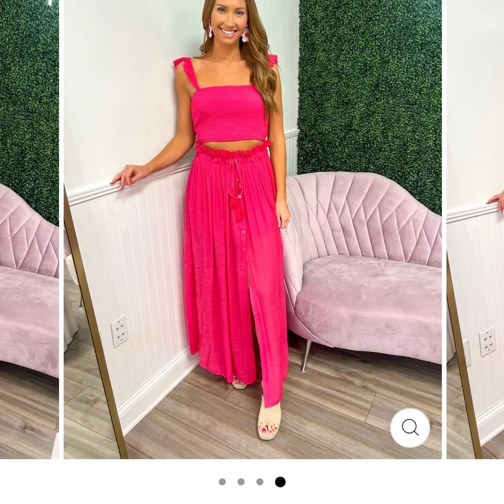 Stylish pink two-piece set featuring a crop top with tie straps and a flowy maxi skirt. Perfect for a chic summer look.