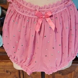 Adorable pink two-piece set with ruffled edges and bow details. Ideal for a cute and playful style.