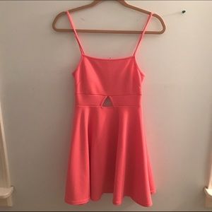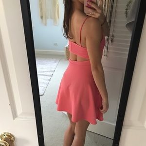 Square neckline, cut outs in the front and in the back- the one in the back isn't as big/awkward as it looks is just the way the dress hangs on the hanger