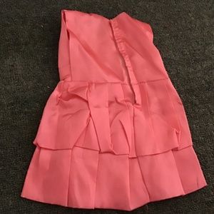 This is a pink fancy dress for an 18 inch doll. It is a silky material and is held together with velcro. There is a small stain in the back of the dress at the bottom.