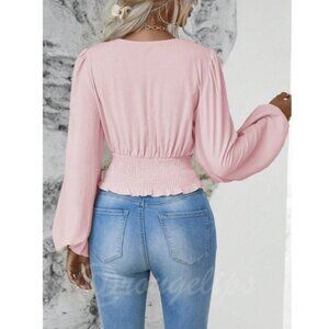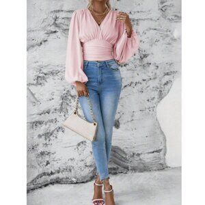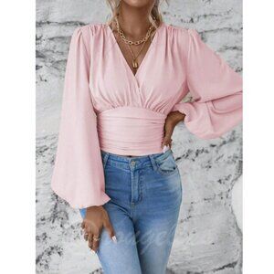 Pink V-Neck Long Lantern Sleeve Ruched Top Shirt Blouse
