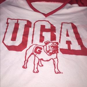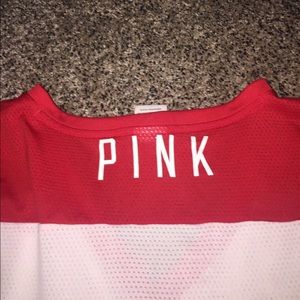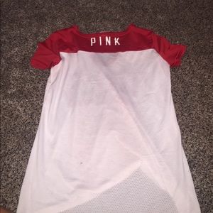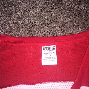 this shirt has some red stains on the front I guess from something bleeding in the washer. As seen in the first photo, they're like faint red stripes on the right side of the wording. The item is still in overall excellent condition. Not available in the VS stores anymore!! Make me an offer