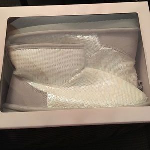 New without tags. VS Pink ivory/beige colored fur lined mukluk booties. Sequined covered. Never worn.