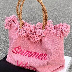 Pink Vacation Women's Large Capacity Letter & Tassel Canvas Tote Bag