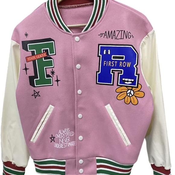 Trendy pink varsity jacket with bold graphic letters. Features white sleeves and colorful accents.