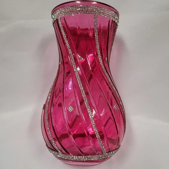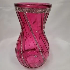 Pink Vase with swirled design and clear rhinestones. 8.75"H, 5.5"W