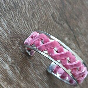 pink velvet braided bracelet featuring sleek silver accents. Perfect for adding a touch of sophistication to any outfit.