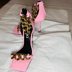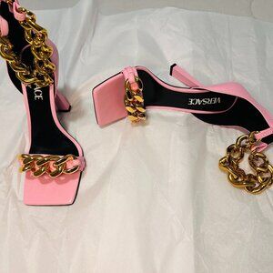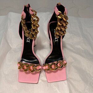 Elegant Versace high heel sandal with Medusa chain Charm, these high-heel ankle sandals are a bold addition to eveningwear. Crafted beautiful and durable leather, the style is enriched with a chunky chain on the ankle and toe straps.
