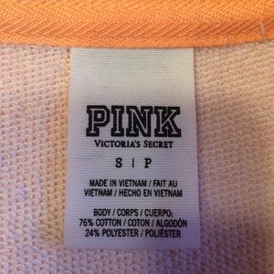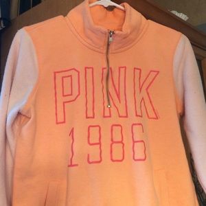 Pink Victoria Secret sweatshirt. In good condition. It says pink 1986 on front, it has 2 pockets in front, it also zips up part way. The sleeves are like a terry cloth material while the rest of sweatshirt is regular material. It's a very bright peach/orange.