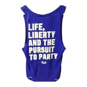 On back of Tank it Says " Life, Liberty and the Pursuit to Party " PINK".